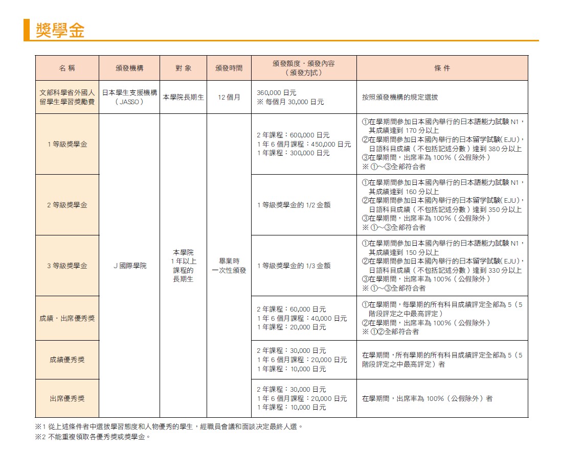 學校另外提供多項獎學金,給予學習成績優異、出勤率高的同學鼓勵,獎學金金額最高60萬日幣~1萬日幣不等,讓同學在異鄉學習減輕經濟負擔。