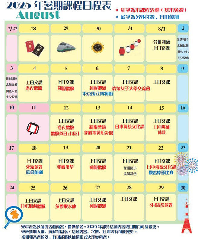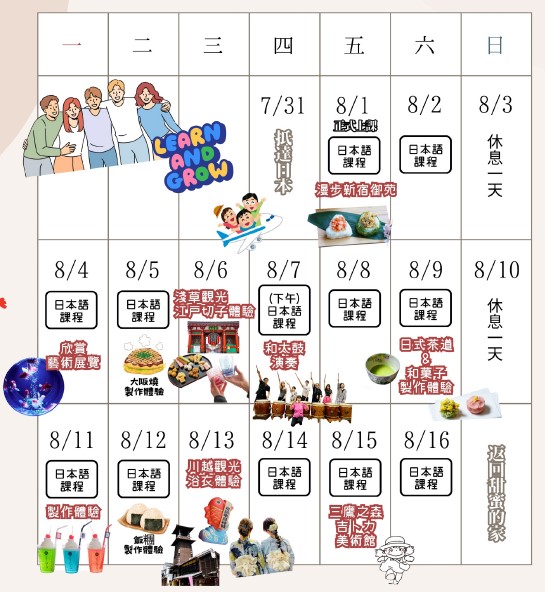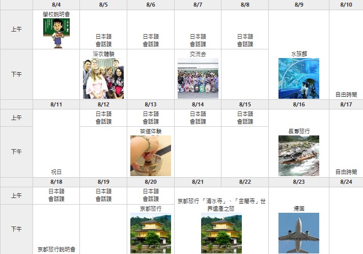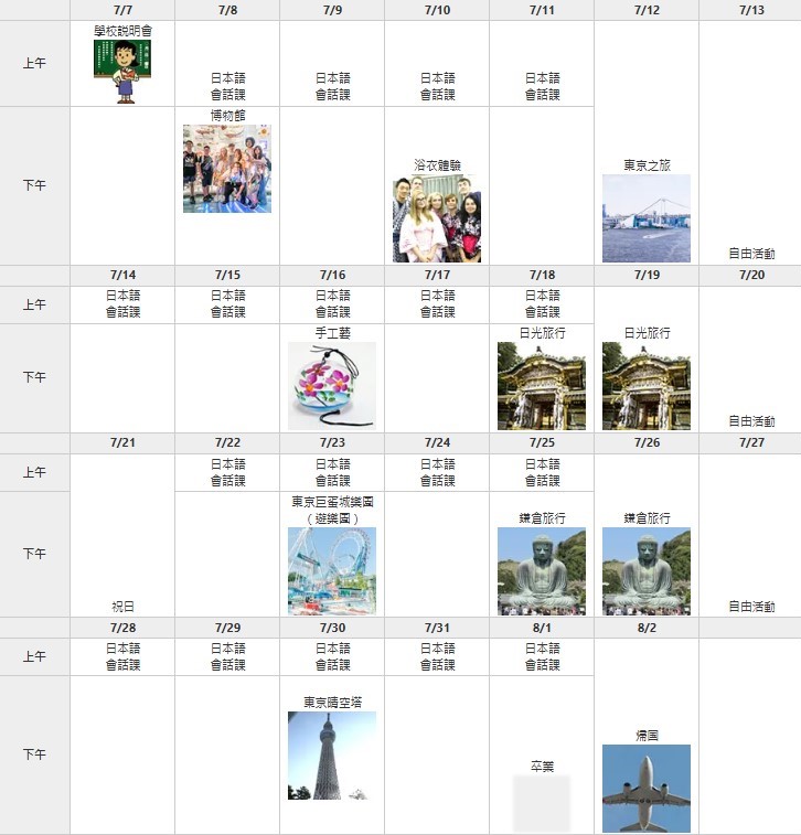 上課時間: 週一~週六 上午:初階日語課程 / 下午:文化體驗或課外活動 |