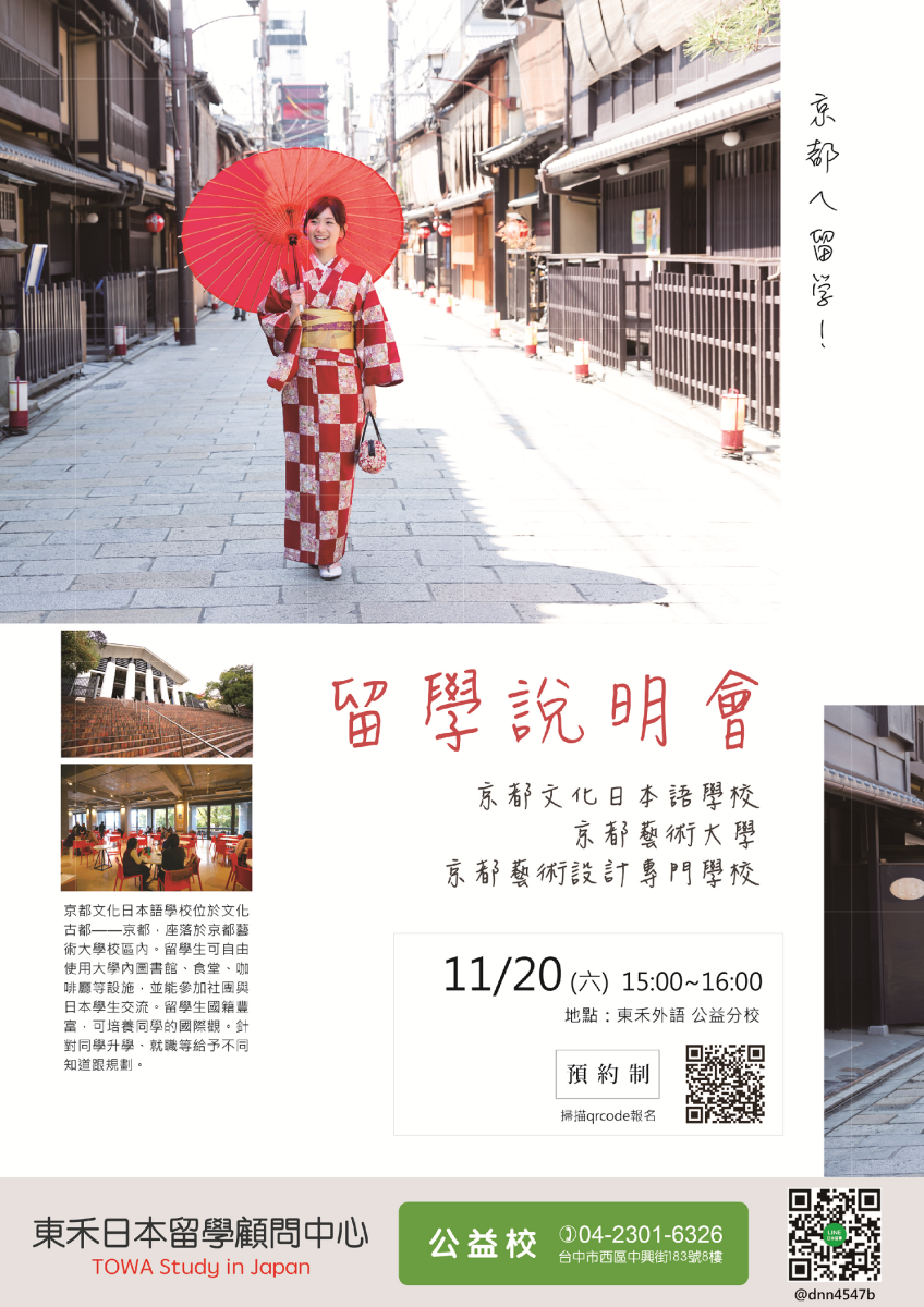 - 參加對象: 想前往京都留學,或是未來想在日本升學至藝術相關科系者,不限東禾在校生