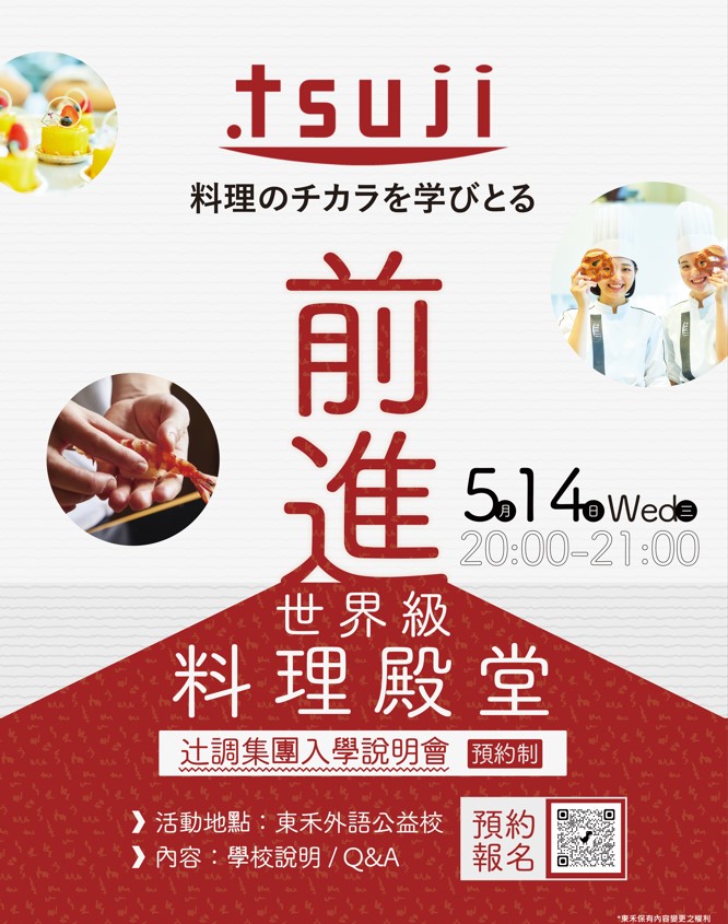 號稱「世界三大料理學校」之一的辻調理師‧ 製菓専門学校,將於5/14(三)在東禾公益校,